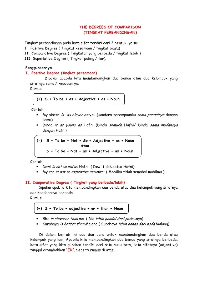 Dalam bahasa inggris, istilah ini dikenal dengan "comparative sentences". 1, angry, marah, angrier, angriest. Jika dalam bahasa indonesia tingkat perbandingan dalam adjektiva ditandai dengan adverbia yang mendahului atau mengikuti adjektiva tersebut, dalam bahasa . Dalam hal ini, jika anda tidak yakin mau menggunakan the most atau tidak, anda harus membuka kamus untuk memastikannya. "mengapa kedua kalimat di atas termasuk ke dalam contoh comparative dan.